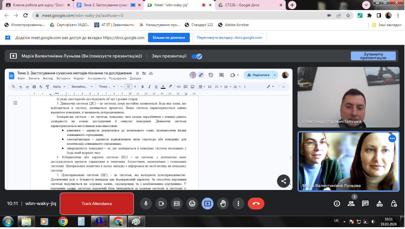 19 березня 2024 року відбулася лекція для аспірантів з дисципліни «Особливості організації сучасних наукових досліджень» на тему: «Застосування сучасних методів наукового пізнання та дослідження», де викладачка глибоко та послідовно пояснила методи наукового дослідження притаманні прикладним галузям наукових пошуків. Під час заняття спостерігалася гарна робоча атмосфера у колективі. Викладачка добре володіє навчальним матеріалом, широко використовує засоби наочності. Навчальний матеріал гарно структурований. Заняття відвідала д.пед.н., проф. О.М.Трифонова.