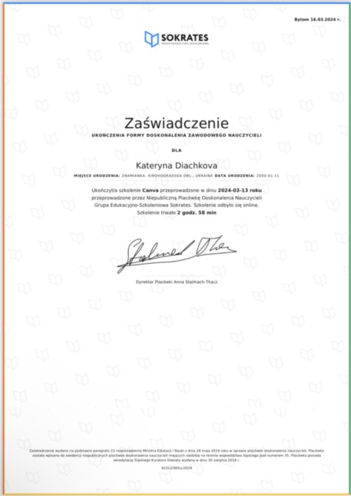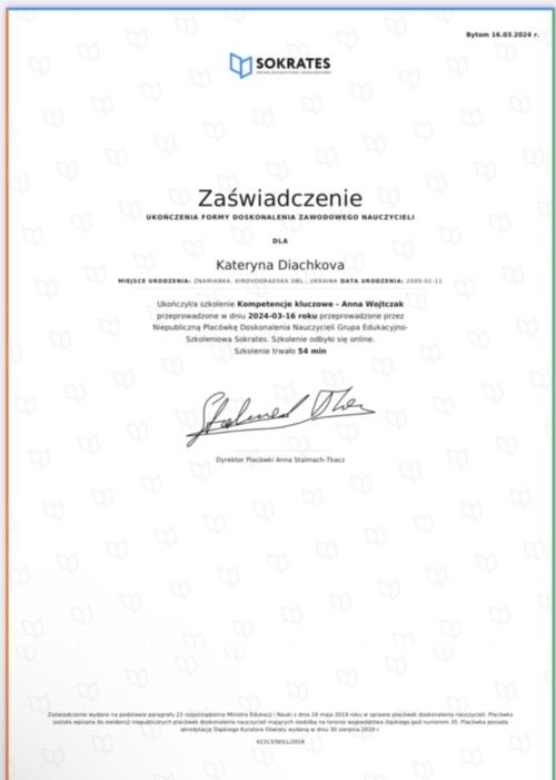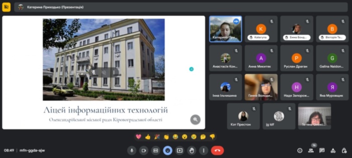 Студентка заочної форми навчання Дячкова К.Г. поділилася досвідом роботи у польському навчальному закладі – Школи початкової (подставової) № 7 з відділами двомовними імені Корнеля Маркушиньского, де вона працює асистентом міжкультурним. Вона порівняла систему освіти та методику викладання біології з українською школою – ліцеєм «Крила України» Знам’янської міської ради Кіровоградської області, де вона проходила виробничу практику очно.