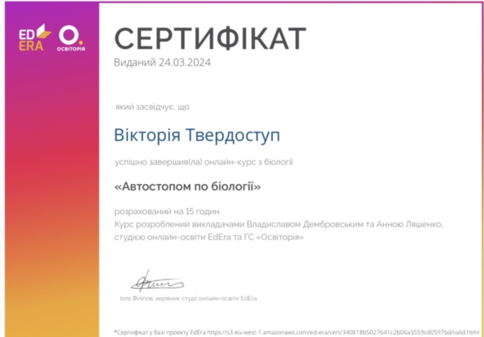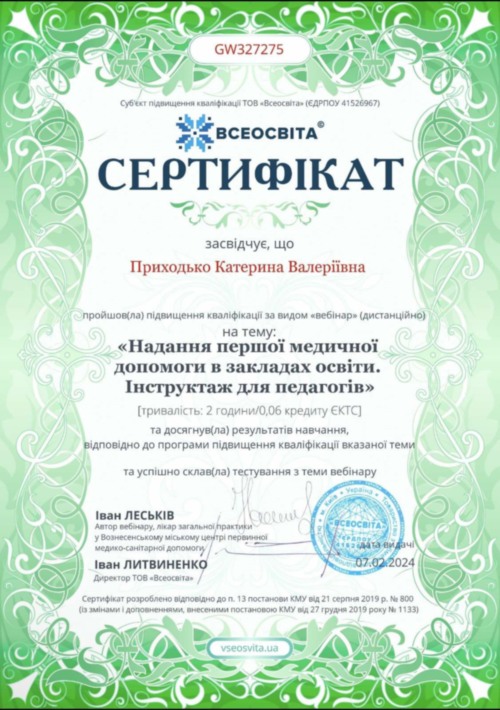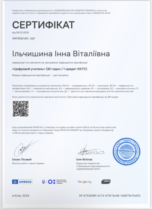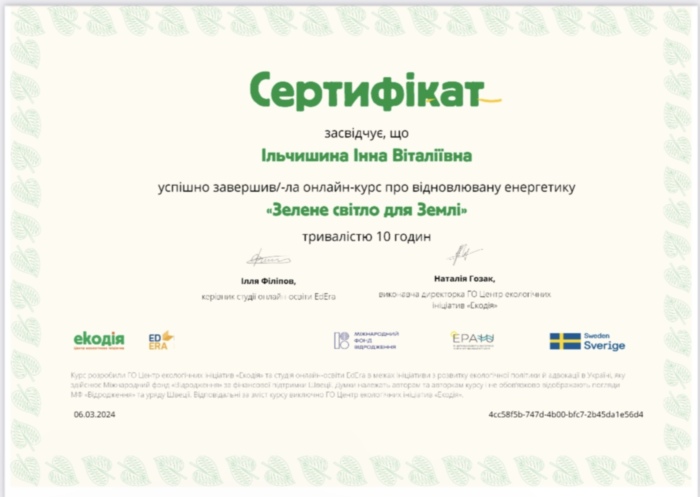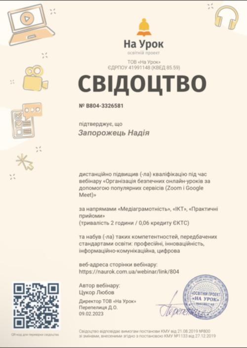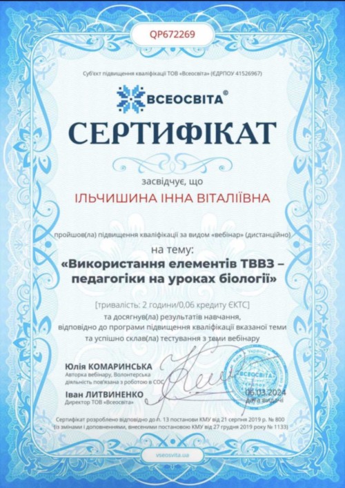 Новікова Є.С. проходила практику на своєму робочому місці у КЗ «Ліцей нових технологій навчання» Кропивницької міської ради», де працює вчителем біології. Вона поділилася з присутніми власними напрацюваннями. Відбувся обмін практичним досвідом між учасниками заходу.