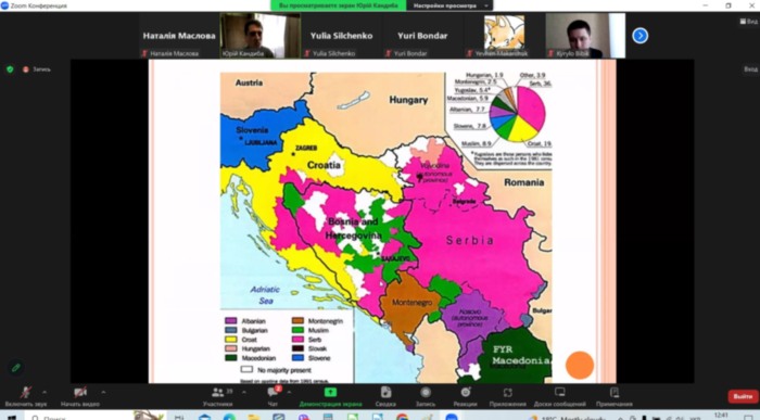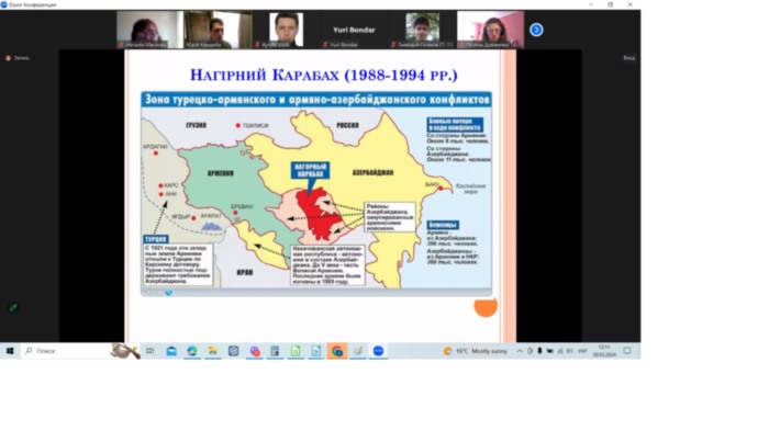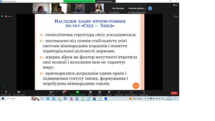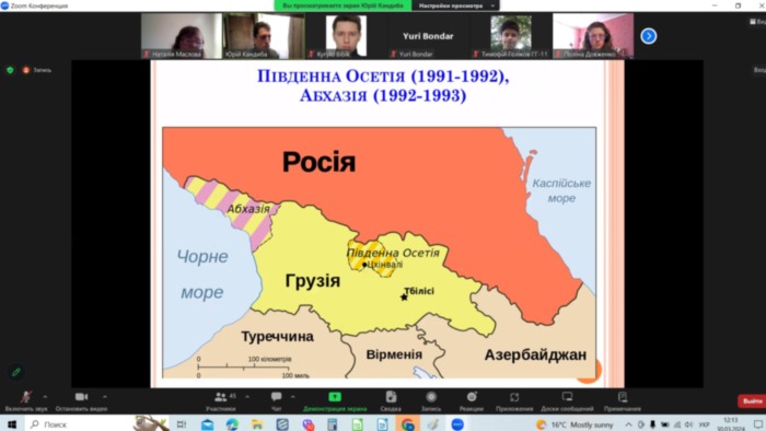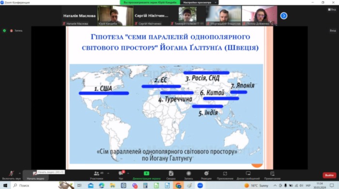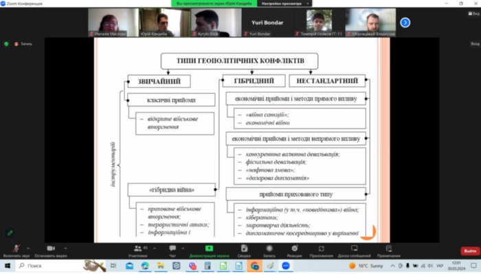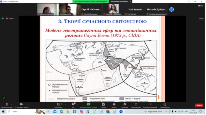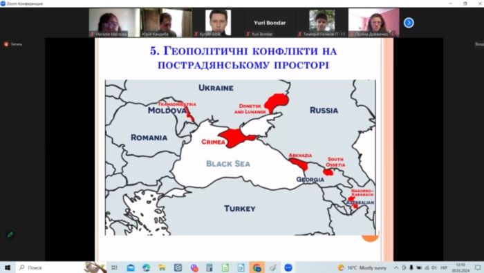 30 березня студенти другого (магістерського) рівня вищої освіти спеціальності “Середня освіта (Географія)” та викладачі-географи відвідали відкриту лекцію з теми «Геополітична структура світу. Геополітичні конфлікти», яку провів кандидат географічних наук, доцент, доцент кафедри соціально-економічної географії і регіонознавства імені Костянтина Нємця факультету геології, географії, рекреації і туризму Харківського національного університету імені Василя Каразіна Юрій Іванович Кандиба. Лекція проведена в рамках проєкту “Геоздибанка”, організованого Українською спілкою молодих географів.