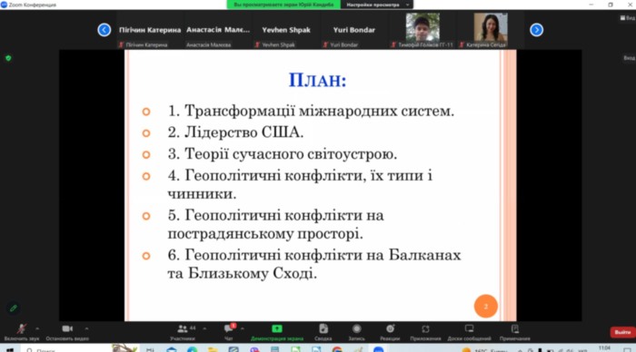 Лекція проведена в інтерактивній формі, після кожного питання відбувалося обговорення в загальному колі проблемних питань сучасного світоустрою. Особливо жваві дискусії розгорнулися навколо причин та майбутніх перспектив вирішення геополітичних конфліктів на пострадянському просторі та Балканах.