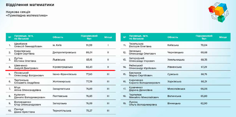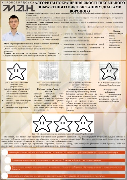 - Шевченко Андрій – ІІ місце у секції «Прикладна математика» із науковою роботою «Алгоритм покращення якості піксельного зображення із використанням діаграми Вороного» (науковий керівник: доц. Акбаш К.С.);