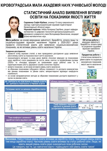 - Садовенко Софія – ІІІ місце у секції «Статистика» із науковою роботою «Статистичний аналіз виявлення впливу освіти на показники якості життя» (науковий керівник: доц.Акбаш К.С.);