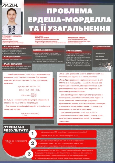 - Григорьєва Дар'я – ІІІ місце у секції «Математика» із науковою роботою «Проблема Ердеша-Морделла та її узагальнення» (науковий керівник: доц.Макарчук О.П.).