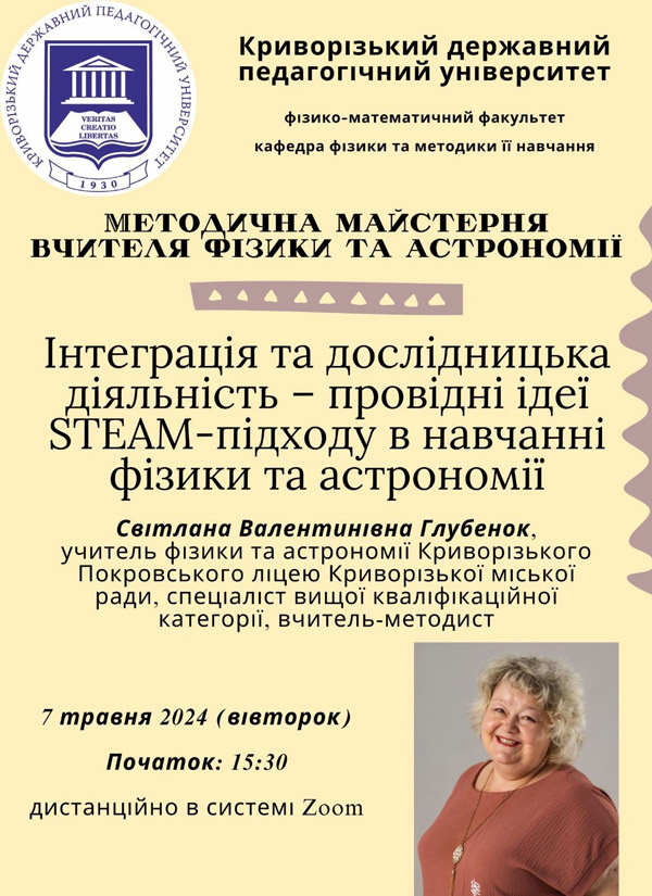 7 травня 2024 року на платформі ZOOM відбулася онлайн лекція вчителя фізики та астрономії Криворізького Покровського ліцею Глубенюк Світлани Валентинівни на тему "Інтеграція та дослідницька діяльність - провідні ідеї STEAM підходу в навчанні фізики та астрономії". Активну участь у заході взяли науково-педагогічні працівники кафедри природничих наук і методик їхнього навчання, а також здобувачі першого (бакалаврського) рівня вищої освіти спеціальності 014 Середня освіта (Природничі науки), другого (магістерського) та третього (освітньо-наукового) рівня вищої освіти спеціальності 014 Середня освіта (Фізика та астрономія).