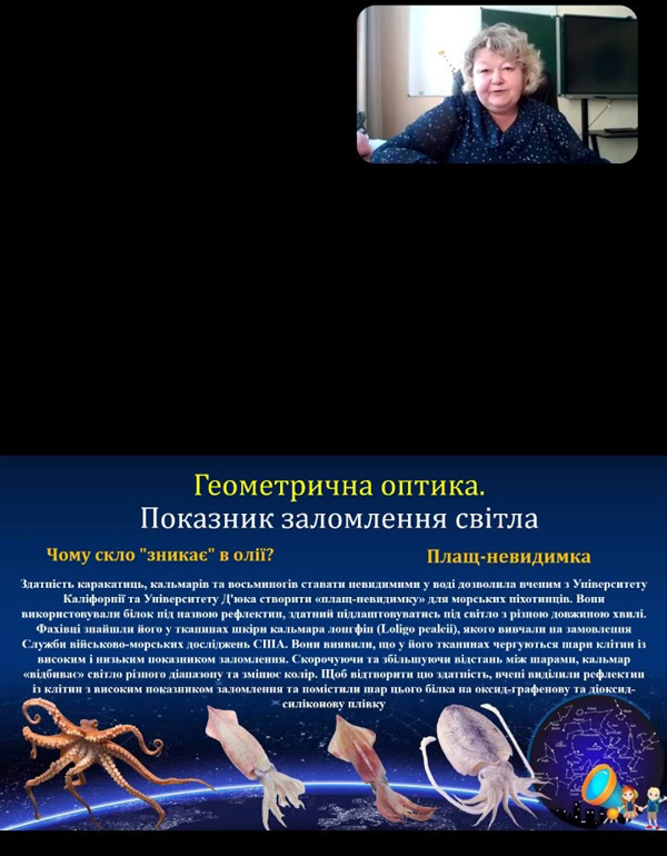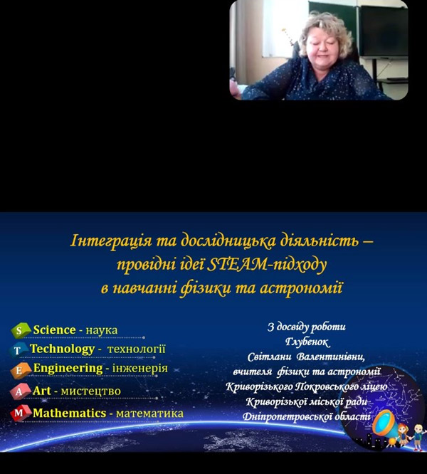 Під час лекції були розглянуті питання STEAM підходу в навчанні фізики та астрономії; STEAM-орієнтованого інтегрованого освітнього середовища; мотивації навчання учнів фізики та астрономії; залучення учнів до самостійної науково-дослідної діяльності; формування вмінь учнів презентувати підсумки своєї роботи тощо. Також викладач поділилась власним досвідом використання цифрових ресурсів під час вивчення фізики та астрономії з метою розвитку STEM компетентностей учнів. Насамкінець Світлана Валентинівна надала відповіді на усі питання учасників заходу, яких було чимало, адже тема лекції є сучасною для природничої освіти і торкається актуального напряму її розвитку.