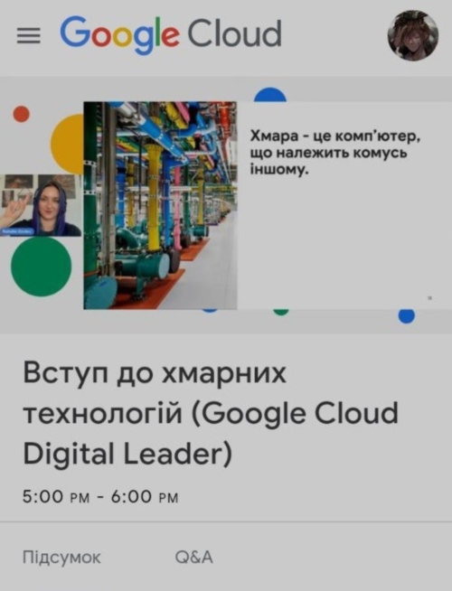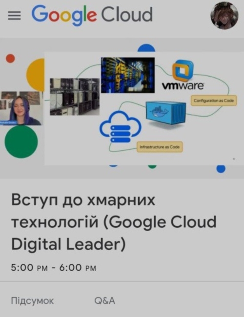 Під час заходу розповіли про сам Google Cloud – хмарну платформу, яка надає різні сервіси для зберігання даних, обчислювальних ресурсів та аналітики. Студент дізнався про переваги використання хмарних серверів, такі як висока масштабованість, надійність та можливість доступу до ресурсів з будь-якого місця.