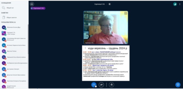 Із завершальним словом виступила організаторка панорамного вебінару доктор педагогічних наук, професор Сергеєва Лариса Миколаївна, завідувачка кафедри професійної і вищої освіти ЦІПО ДЗВО «Університет менеджменту освіти» НАПН України, яка подякувала усім за плідну співпрацю, цікаві ідеї та натхнення й вручила сертифікати учасникам заходу.
