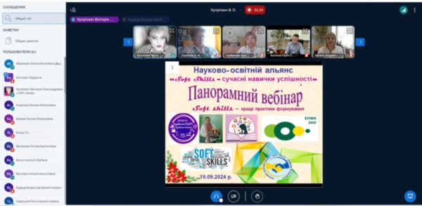 19 вересня об 11:30 відбувся панорамний вебінар «Soft skills – кращі практики формування». До членів Всеукраїнського науково-освітнього альянсу «Soft skills – сучасні навички успішності» було прийнято два нових члени-заклади освіти, це Чугуївський регіональний центр професійної освіти Харківської області та Економіко-правничий фаховий коледж Запорізького національного університету, викладачі яких долучилися до вебінару із доповідями.