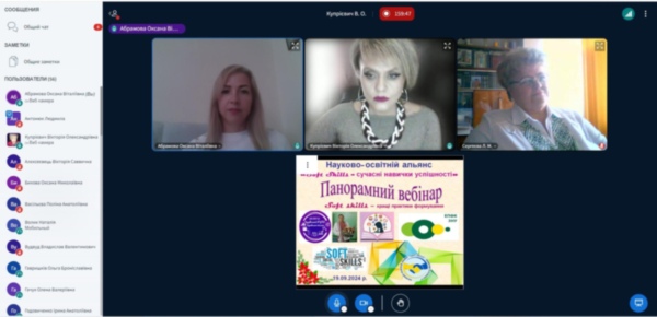 На запрошення організаторів перед присутніми із обміну думками виступила кандидат педагогічних наук, доцент Оксана Віталіївна Абрамова, завідувач секції технологічної та професійної освіти факультету математики, природничих наук та технологій Центральноукраїнського державного університету імені Володимира Винниченка, член Президіуму Координаційної ради Науково-освітнього альянсу. Вона висловила щиру подяку організаторам та доповідачам за активну участь й змістовні виступи. У своїй промові вона наголосила, що панорамний вебінар «Soft skills – кращі практики формування» став надзвичайно важливою платформою для обміну ідеями та досвідом, а також підтвердив високий рівень професіоналізму наших освітян та їхню здатність відповідати викликам сучасного світу. Під час роботи вебінару, присутні переконалися, що розвиток м’яких навичок – це важлива складова успішної освіти, яка дозволяє виховувати креативних, ініціативних та готових до викликів особистостей.