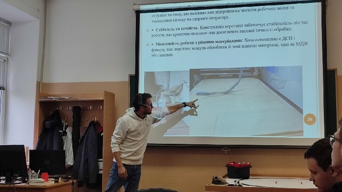 У ході зустрічі Тимур Бас ознайомив аудиторію зі складним процесом використання систем автоматизованого проєктування при виготовленні виробів (наприклад, меблів) та виробів з дерева на верстатах з числовим програмним керуванням (ЧПК). Лектор повідомив, що для того, щоб стати фахівцем йому необхідно було пройти етапи становлення: від складної фізичної ручної праці, до освоєння новітніх автоматизованих верстатів, основ програмування та програмних засобів Аspire 9.5; Базіс; Mach3; Ncstudio; ArtCam; AutoCad; PhotoShop. Показав приклади проекту виготовлення виробу – стола від «А до «Я»: замовник, проект, виробництво, монтаж, використання.