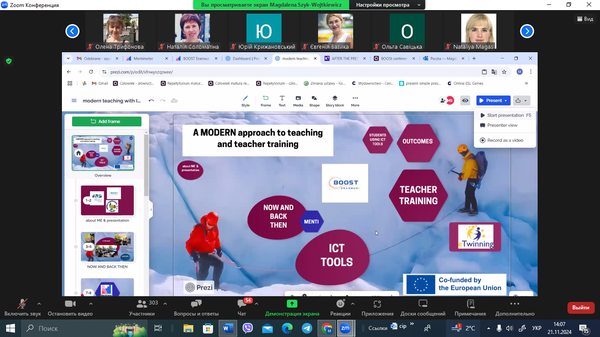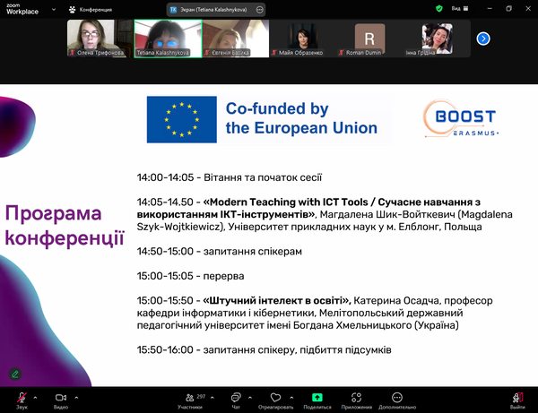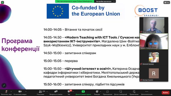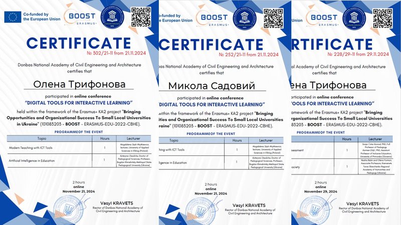 У листопаді 2024 р. викладачі кафедри математики та цифрових технологій (д.пед.н., проф. М.І.Садовий та д.пед.н., проф. О.М.Трифонова) долучилися до конференції «Цифрові інструменти для інтерактивного навчання», що проводилася в межах імплементації Erasmus+ проєкту BOOST (Bringing Opportunities and Organizational Success To Small Local Universities in Ukraine).