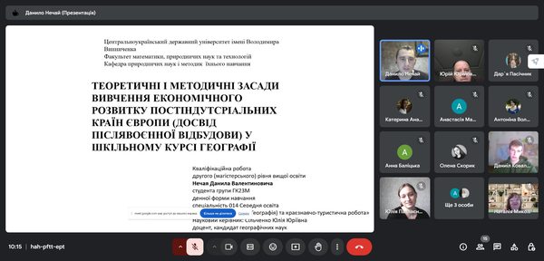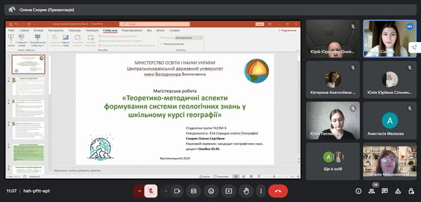 Здобувачі вищої освіти другого (магістерського) рівня при підготовці кваліфікаційних робіт досліджували методичні аспекти застосування в освітньому процесі з географії геосервісів, засобів дистанційного зондування Землі, інтерактивних сервісів для створення тестів та вправ для миттєвого опитування; методику формування геологічних знань на уроках географії; теоретичні і методичні засади вивчення економічного розвитку постіндустріальних країн Європи (досвід післявоєнної відбудови) у шкільному курсі географії; дидактичні можливості міського туризму як форми екскурсійно-туристичної роботи з шкільною та студентською молоддю; особливості використання рекреаційно-туристичного потенціалу м. Кропивницького в краєзнавчо-туристичній роботі в школі. Всі представлені на захист роботи містили результати експериментальних досліджень та авторські методичні розробки здобувачів.