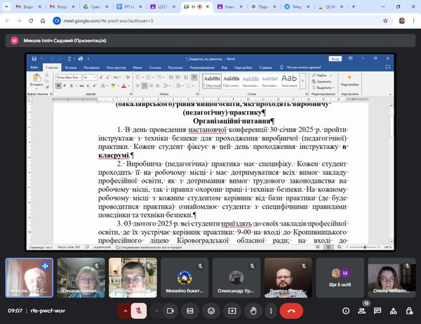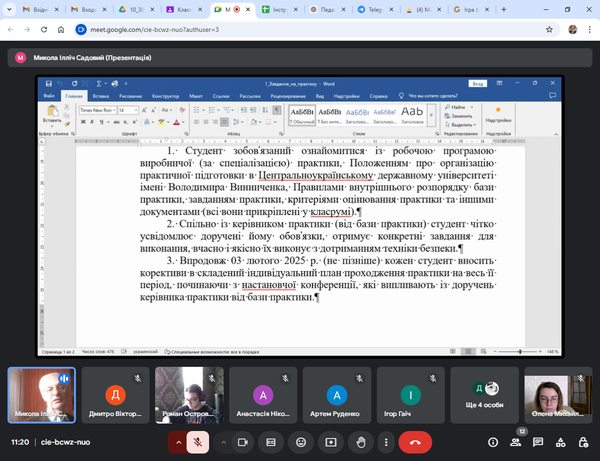 К.пед.н. Д.В.Соменко детально пояснив студентам етапи проходження практик та виклики, з якими можуть зіткнутися студенти під час практичної діяльності. Усі питання, що виникли, були обговорені, а студенти отримали вичерпні відповіді від викладачів.