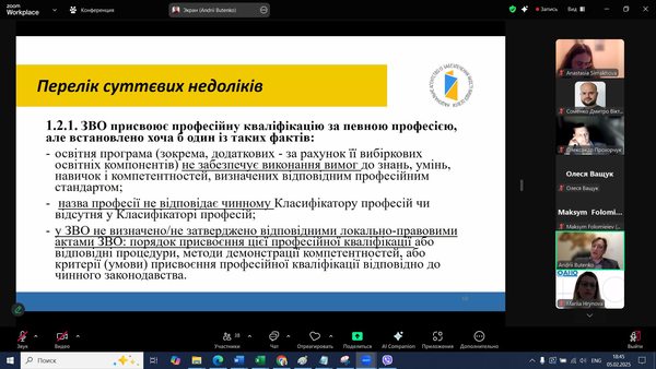 5 лютого 2025 року науково-педагогічні працівники кафедри математики та цифрових технологій д.пед.н., проф. О.М. Трифонова та к.пед.н. Д.В. Соменко долучилися до онлайн-зустрічі Ради молодих учених при Міністерстві освіти і науки України з Головою Національного агентства із забезпечення якості вищої освіти (НАЗЯВО) Андрієм Бутенком. Темою обговорення стали «Основні параметри внутрішньої системи забезпечення якості: застосування для покращення освітніх програм третього рівня вищої освіти». Говорили про систему якості вищої освіти: що змінилося для університетів?