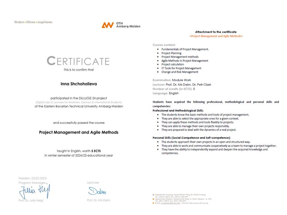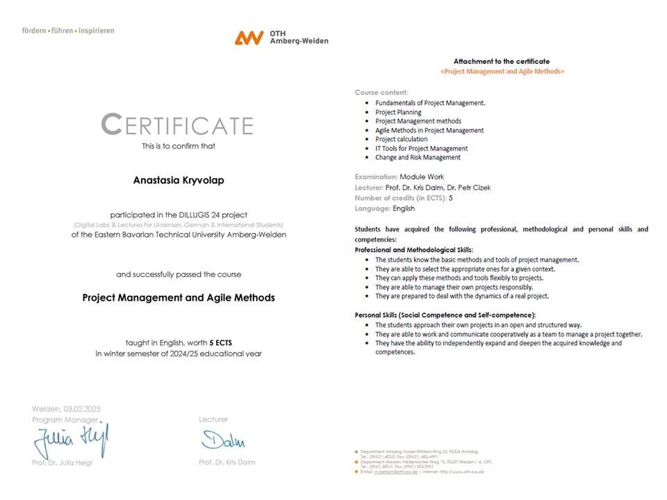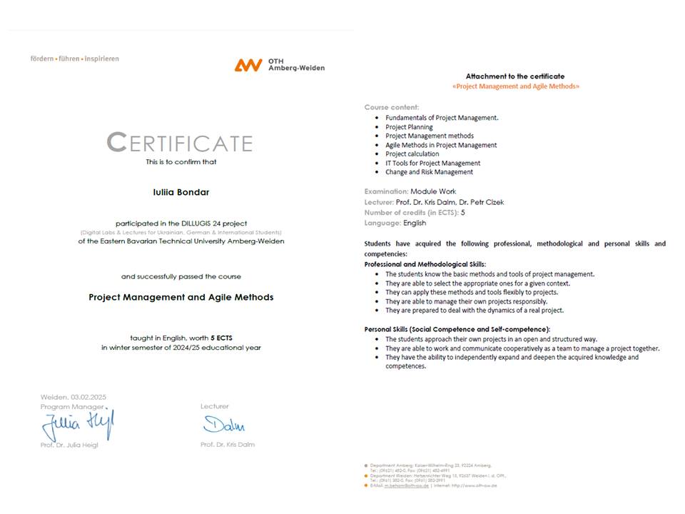 Дана програма зосереджена на темі «Управління проєктами та Agile методами», що стає все більш актуальним в сучасному світі. Навчання відбувалось англійською мовою професорами Східно-баварського університету Амберг-Вайден (Німеччина).