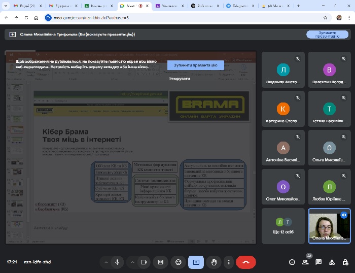Д.пед.н., професор, завідувач кафедри математики та цифрових технологій О.М.Трифонова презентувала лекцію на тему «Інноваційна діяльність педагога за спеціалізацією (проєктна діяльність) в умовах безпечного інформаційного середовища». У ході виступу було висвітлено ключові аспекти організації проєктної діяльності в цифровому освітньому просторі, зокрема роль цифрових інструментів у створенні інтерактивного освітнього контенту, командній роботі та оцінюванні результатів навчання. На практичному занятті слухачі отримали можливість опрацювати методики розвитку цифрової компетентності та особливості впровадження проєктного підходу у власну педагогічну діяльність. Особливу увагу було приділено питанням кібербезпеки, захисту персональних даних та відповідальному використанню цифрових ресурсів. Активне обговорення та практичні завдання дозволили учасникам поглибити знання щодо інноваційних методів навчання в умовах цифровізації освіти.