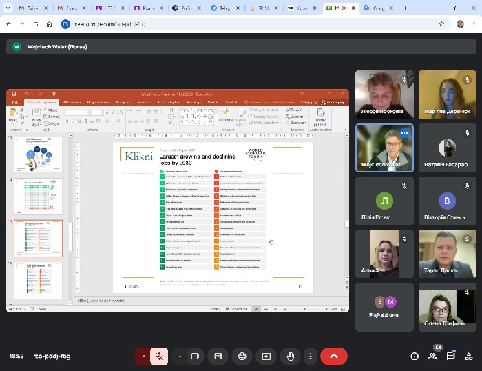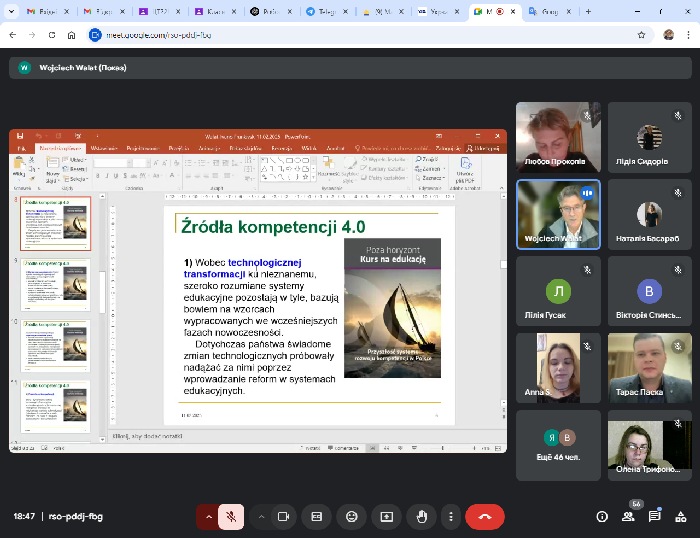 Захід проходив польською мовою, і всі учасники мали можливість задавати питання професору, отримуючи компетентні відповіді та цінні поради. У ході лекції обговорювалися ключові виклики, з якими стикається освіта, необхідність розвитку гнучких компетенцій, адаптації до швидких технологічних змін та важливість міждисциплінарного підходу в навчанні. Особливу увагу приділили ролі цифрових технологій у сучасній освіті та тому, як вони впливають на підготовку майбутніх фахівців.