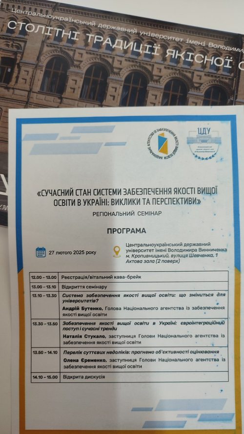 27 лютого 2025 року відбувся регіональний семінар «Cучасний стан системи забезпечення якості вищої освіти в Україні: виклики та перспективи», який організувало Національне агентство із забезпечення якості вищої освіти у партнерстві з Центральноукраїнським державним університетом імені Володимира Винниченка.