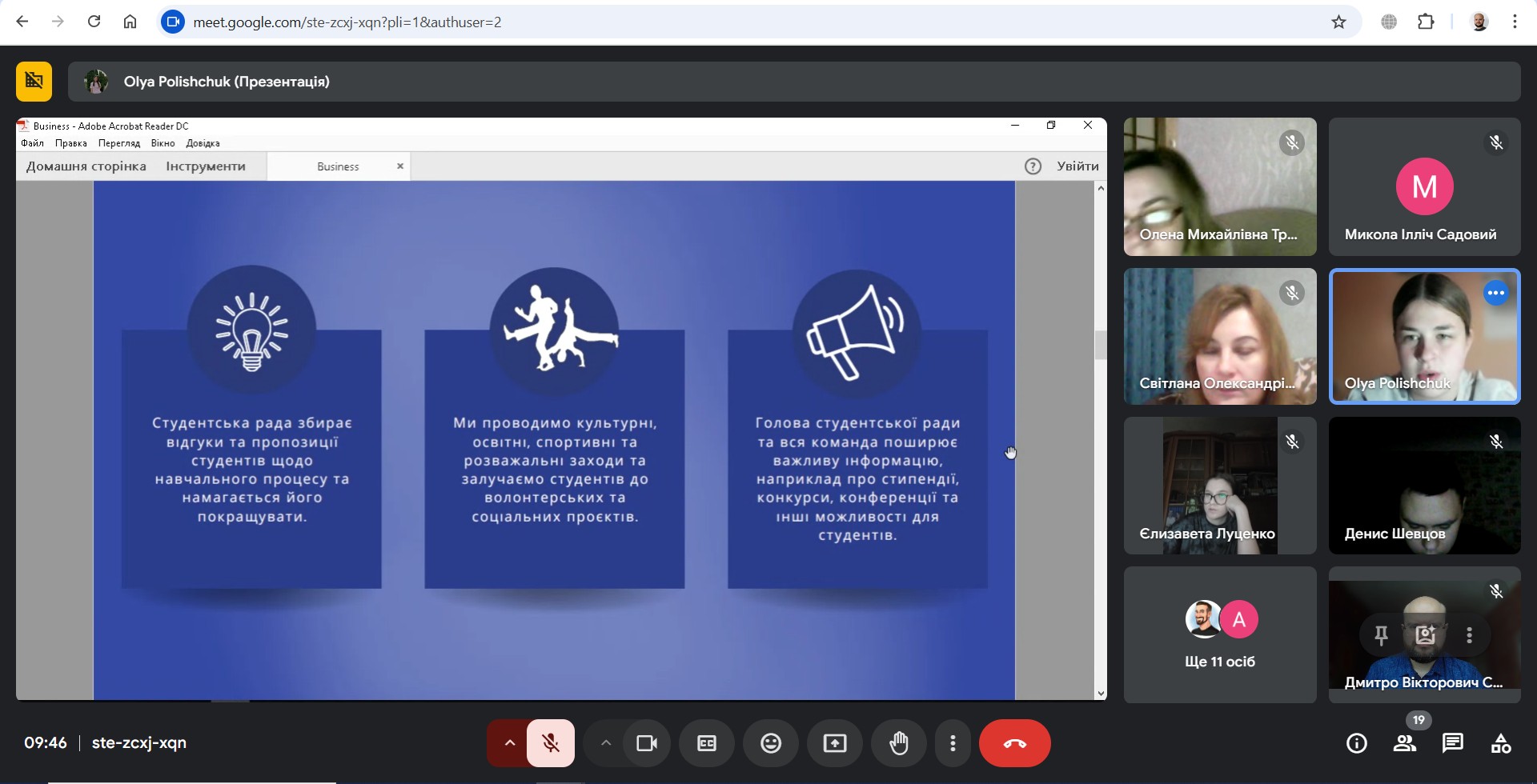- Шлянчак Світлана Олександрівна поцікавилася, чи планується набір нових активних студентів до складу студради. Поліщук Ольга відповіла, що двері студентської ради завжди відкриті для всіх охочих: "Ми раді кожному, хто прагне змінювати факультет на краще".