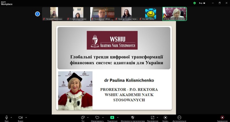 - «Глобальні тренди цифрової трансформації фінансових систем: адаптація для України». Доповідач: Paulina KOLISNICHENKO, dr.n.e., проректор, виконуюча обов’язки ректора WSHIU Akademii Nauk Stosowanych (Познань, Польща). Доповідь була присвячена міжнародному досвіду цифровізації фінансового сектору (ЄС, США) та можливостям його адаптації в Україні. Було підкреслено, що цифрові інструменти сприятимуть інтеграції України у світовий фінансовий простір, залученню інвестицій та забезпеченню стійкого економічного розвитку.