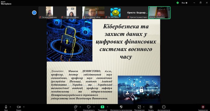 - «Кібербезпека та захист даних у цифрових фінансових системах воєнного часу». Доповідач: Микола ДЕНИСЕНКО, д.е.н., професор, доктор габілітований наук економічних, професор наук економічних (республіка Польща), академік Академії будівництва України та Української технологічної академії, професор кафедри менеджменту та підприємництва Центральноукраїнського державного університету імені Володимира Винниченка. Основний акцент зроблено на захист фінансових даних у період активних кібератак. Було розглянуто технології шифрування, двофакторної аутентифікації та кіберрезервних копій даних.