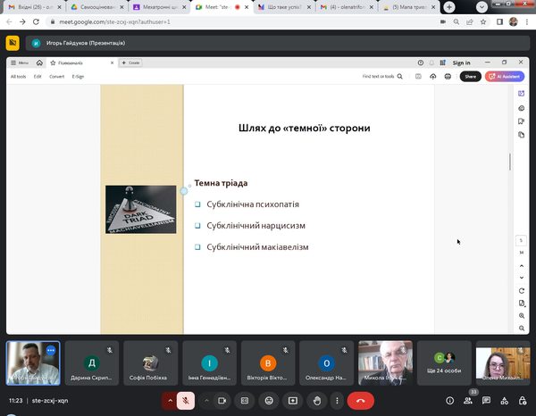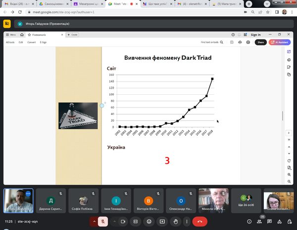 Говорили про мотивацію його досягнення та психологічні аспекти цього процесу. Зокрема, розглядалися риси конструкта «Темна тріада»: