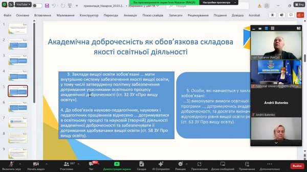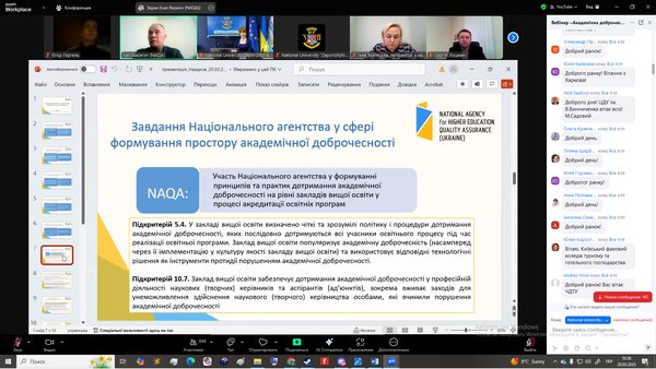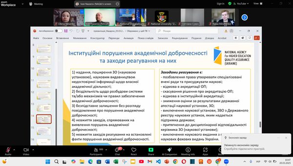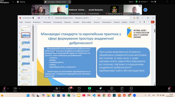 20 березня 2025 р. відбувся вебінар «Академічна доброчесність: виклики, проблеми та перспективи». Вебінар проводився за підтримки Національного агентства із забезпечення якості вищої освіти, ГО «Прогресильні».