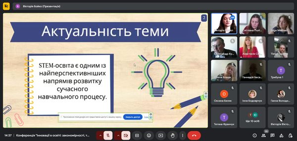 Учасників конференції привітали керівники та адміністрація університету, наголосили на важливості та актуальності заявленої теми конференції та побажали всім успіху. Серед учасників конференції були відомі науковці України, доктори наук, професори, кандидати наук, доценти, які у своїх доповідях наголошували на необхідності йти у ногу з часом та бути завжди в трендах сучасної освіти. Наш регіон та університет представляли студентки 4 курсу групи БХ21Б Бойко Вікторія та Сус Лілія у співавторстві з науковим керівником, професором Г.В. Дефорж, які надіслали тези до напрямку конференції «Інноваційні проєкти, моделі та технології в проєкції освітніх викликів» на тему: «Використання STEM-технологій у процесі вивчення біології» та «Віртуальні лабораторії та симуляції на уроках біології основної школи». З доповіддю виступила Бойко Вікторія, де розкрила поняття та важливість STEM-технологій у процесі вивчення біології та навела приклади застосування таких технологій на уроках під час проходження виробничої (педагогічної) практики у школі.