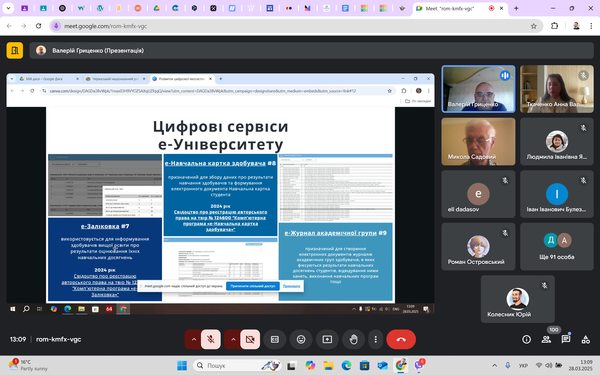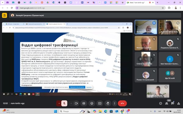 28 березня 2025 року відбулася гостьова лекція «Розвиток цифрового освітнього середовища у ЗВО: практичний аспект», яку провели Валерій Григорович Гриценко – доктор педагогічних наук, професор, директор навчально-наукового центру цифрової трансформації Черкаського національного університету імені Богдана Хмельницького та Анна Валеріївна Ткаченко – кандидат педагогічних наук, доцент, директор навчально-наукового інституту інформаційних та освітніх технологій Черкаського національного університету імені Богдана Хмельницького, яких запросили завідувач кафедри математики та цифрових технологій, професор Олена Михайлівна Трифонова та професор Микола Ілліч Садовий.