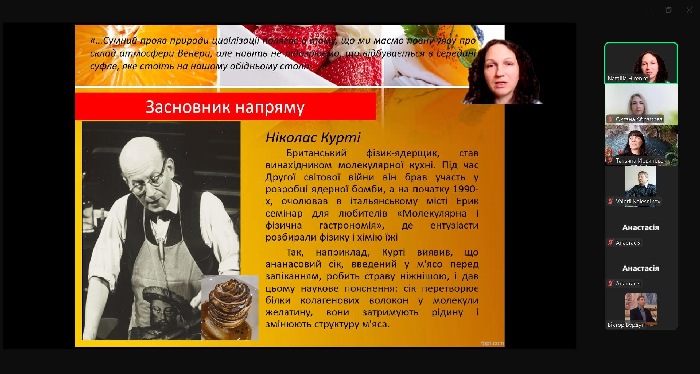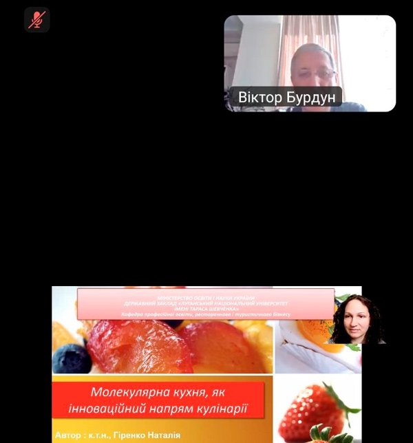 3 квітня 2025 року Віктор Бурдун, кандидат педагогічних наук, доцент, завідувач кафедри професійної освіти, ресторанного і туристичного бізнесу ДЗ «Луганський національний університет імені Тараса Шевченка» (м. Лубни) радо запросив викладачів та студентів факультету математики, природничих наук та технологій нашого університету відвідати онлайн лекцію на тему «Молекулярна кухня як інноваційний напрям кулінарії», яку провела Гіренко Наталія Ігорівна, кандидат технічних наук, доцент ЛНУ.