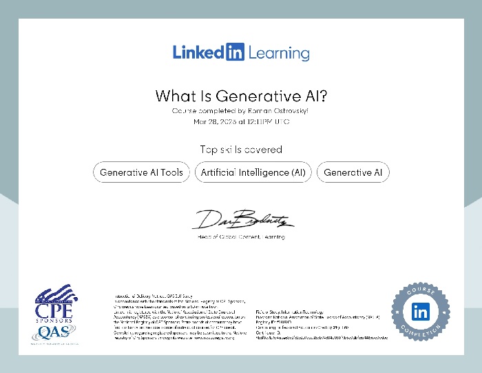 Зокрема, студент Островський Роман протягом практики успішно завершив низку онлайн-курсів на платформі LinkedIn Learning, отримавши відповідні сертифікати.