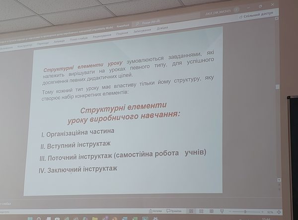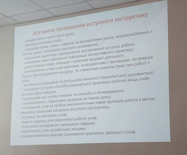 Студенти мали можливість безпосередньо зануритися в освітнє середовище закладу професійної (професійно-технічної) освіти, ознайомитися зі специфікою ресурсного забезпечення освітнього процесу, сучасними підходами до проведення уроків виробничого навчання. Особливу увагу було приділено структурним елементам уроку, алгоритму вступного інструктажу, ролі викладача у формуванні фахових компетентностей здобувачів освіти.