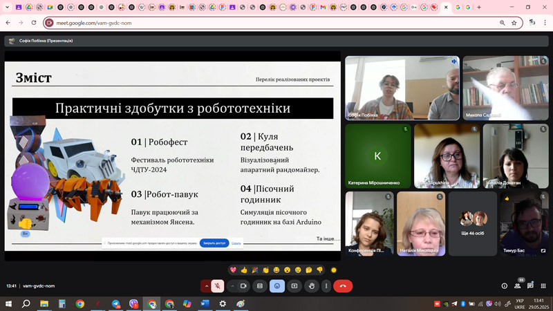 Дмитро Соменко кандидат педагогічних наук, старший викладач кафедри математики та цифрових технологій, Софія Побіяха студентка спеціальності Професійна освіта (Цифрові технології) Центральноукраїнського державного університету імені Володимира Винниченка; Алла Гобова викладач фізики та інформатики, Анастасія Шульга студентка спеціальності Комп'ютерні науки Кам’янського енергетичного фахового коледжу продемонстрували результати досліджень з проєктної діяльності з робототехніки та її практичної реалізації в освітньому процесі ОП Професійна освіта (Цифрові технології) та ОП Комп'ютерні науки, розкрили роль штучного інтелекту в сучасній природничо-математичній освіті.