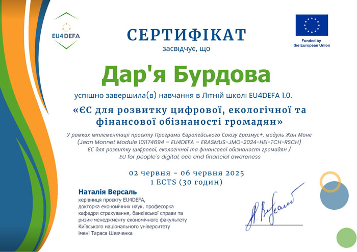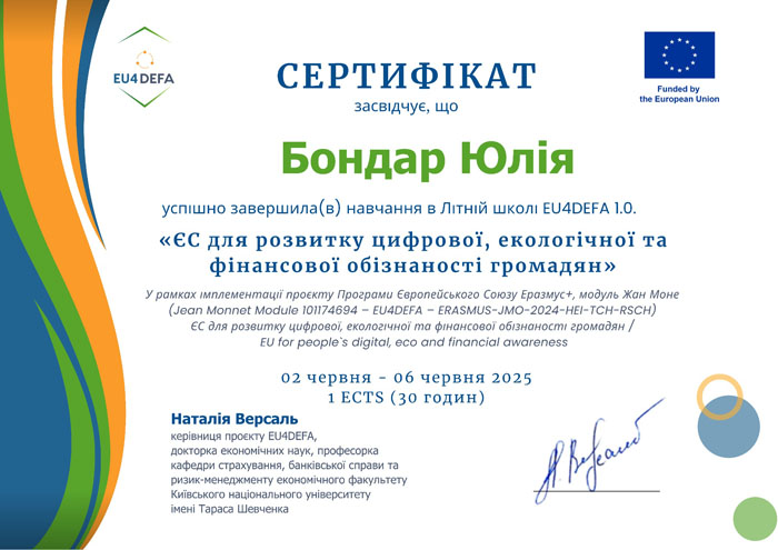Цей захід відбувся у рамках реалізації модуля Жан Моне Програми Європейського Союзу Erasmus+: «ЄС для розвитку цифрової, екологічної та фінансової обізнаності громадян / EU for people’s digital, eco and financial awareness» (Jean Monnet Module 101174694 – EU4DEFA – ERASMUS-JMO-2024-HEI-TCH-RSCH).
