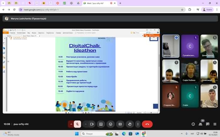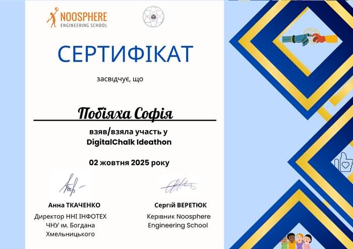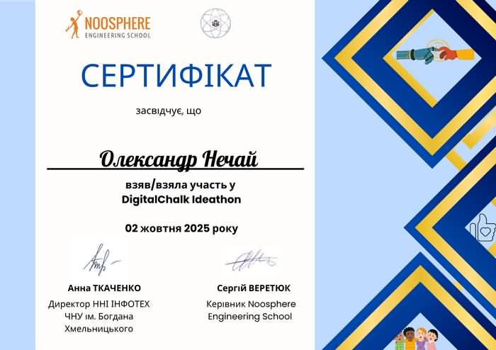 Студенти групи ЦТ23Б (Іващенко Денис, Побіяха Софія, Колесник Юрій, Нечай Олександр та Шевцов Денис) Центральноукраїнського університету імені Володимира Винниченка долучилися до Всеукраїнського ідейного марафону DigitalChalk Ideaton, де представили власний інноваційний проєкт у сфері цифрової освіти. Захід відбувався 02 жовтня 2025 р. на базі Черкаського національного університету імені Богдана Хмельницького.