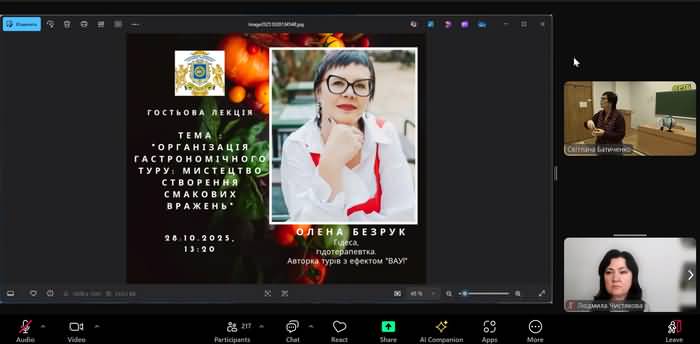 28 жовтня 2025 року відбулася перша гостьова лекція «Організація гастрономічного туру. Мистецтво створення смакових вражень», яку провела Олена Безрук – гідеса, гідотерапевтка та авторка авторських турів, відомих своїм унікальним «ВАУ-ефектом». Лекція зібрала понад 200 учасників онлайн із різних регіонів України – Києва, Чернівців, Черкас та інших міст. Пані Олена, одна з авторок популярної екскурсії «Смачний Київ», поділилася власним досвідом у сфері гастрономічного туризму та розкрила секрети створення емоційно насичених і змістовних туристичних маршрутів. Серед ключових питань, які викликали найбільшу зацікавленість слухачів: формування особистого бренду та ефективна самопрезентація в інформаційному просторі; розуміння своєї цільової аудиторії та вибудовування комунікації на основі спільних цінностей; мистецтво створення емоційних вражень, які стають головною метою туру; важливість емоційного відновлення та гнучкості гіда; тенденції переходу від масових турів до автентичних, персоналізованих подорожей; налагодження співпраці з нішими крафтовими виробництвами; роль повної передоплати як гарантії участі клієнтів. Звертаючись до студентів, пані Олена наголосила, що сучасний фахівець має постійно вдосконалюватися, читати професійну літературу, мислити творчо та шукати власний шлях у професії.
