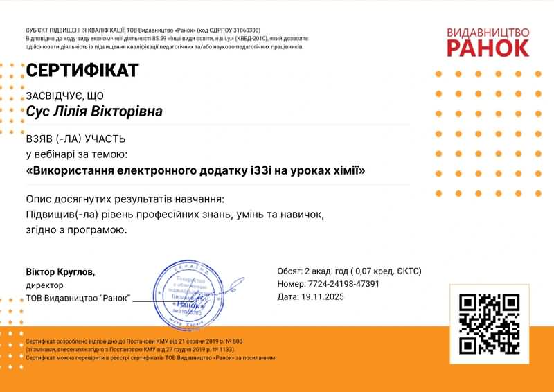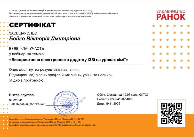 На кафедрі природничих наук і методик викладання значна увага приділяється залученню професіоналів-практиків до проведення занять. Так, 19 ЛИСТОПАДА 2025 р. д.п.н., професор Валентина Плющ та здобувачі освіти спеціальності 014 Середня освіта «Біологія та здоров’я людини, Хімія» другого (магістерського) рівнів вищої освіти взяли участь у вебінарі «Використання електронного додатку ІЗЗІ на уроках хімії», під час якого спікерка Лідія Мартинець, методистка з хімії та біології видавництва "Ранок", вчителька біології та хімії надала практичні рекомендації щодо використання електронного додатку ІЗЗІ під час уроків хімії.