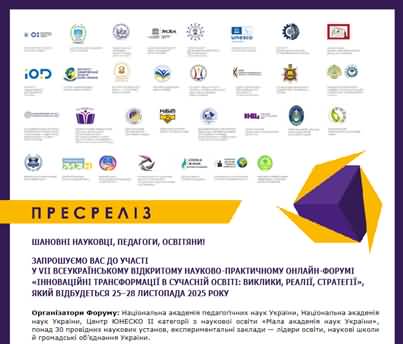 25 листопада 2025 року розпочато роботу VІІ Всеукраїнського відкритого науково-практичного онлайн-форуму «Інноваційні трансформації в сучасній освіті: виклики, реалії, стратегії», який триватиме 25–28 листопада 2025 року.