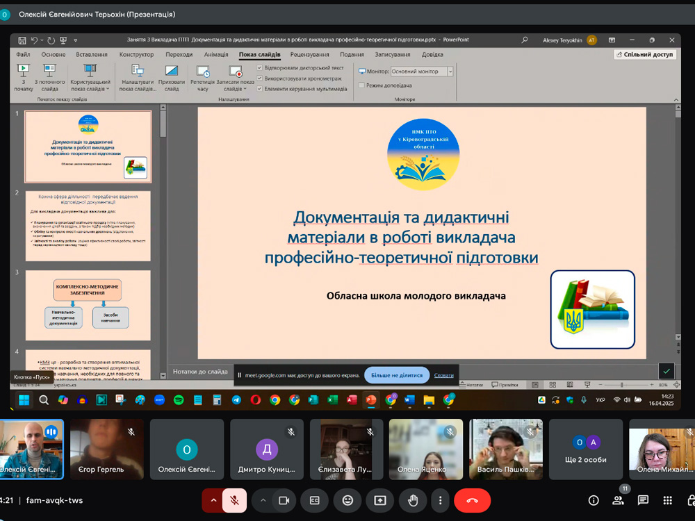 16 квітня 2025 року для студентів освітньої програми «Професійна освіта (Цифрові технології)» відбулася чергова серія практико-орієнтованих занять, які провів фахівець-практик, заступник директора з навчально-виробничої частини Кропивницького вищого професійного училища Терьохін Олексій Євгенійович. У межах дисципліни «Методика навчання інформатичних дисциплін» здобувачі вищої освіти опрацювали документацію та дидактичні матеріали, необхідні в роботі викладача професійно-теоретичної підготовки, ознайомилися з положеннями професійного стандарту «Педагог професійного навчання» та вивчили особливості складання комплексного опорного конспекту з використанням текстів, таблиць і схем.