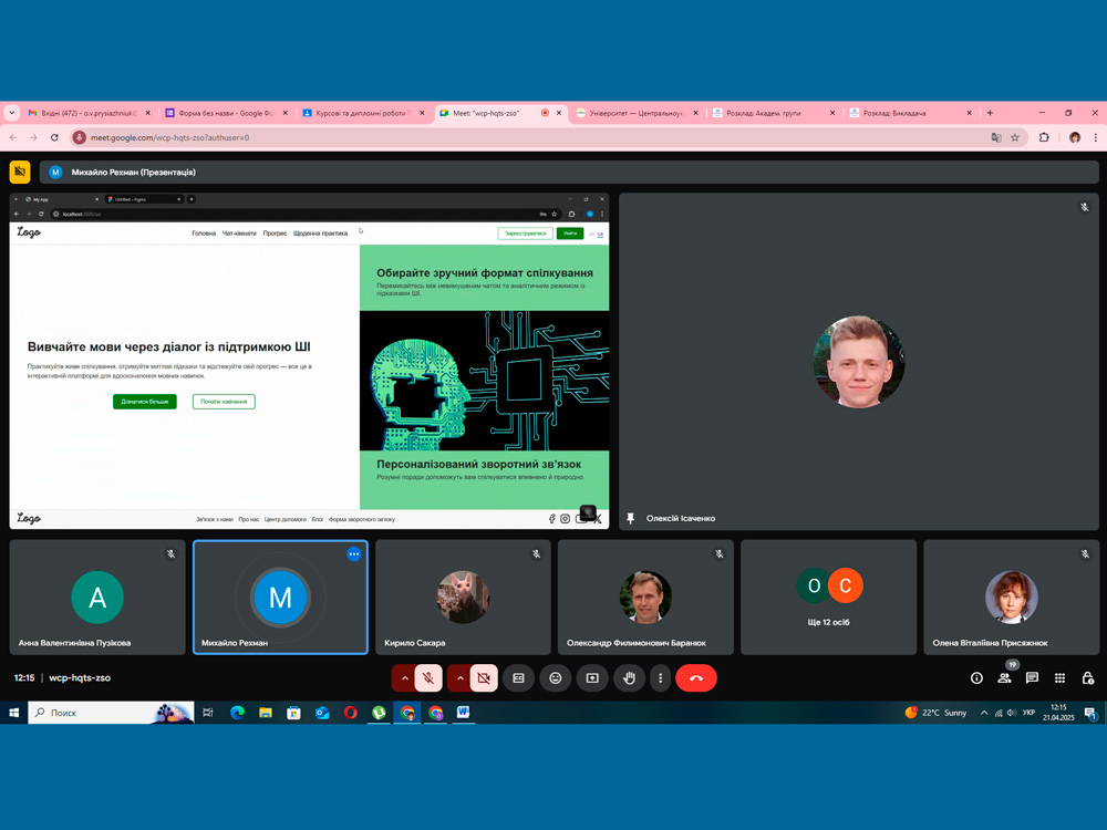 21 квітня на другій та третій парі в онлайн форматі з ініціативи студентів випускної групи бакалаврату спеціальності 122 Комп’ютерні науки КН21Б відбулось відкрите обговорення актуальних питань досліджень студентів з викладачами кафедри інформатики, програмування, штучного інтелекту та технологічної освіти.