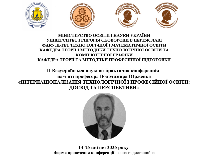 14 квітня 2024 року в онлайн форматі розпочалася ІІ Всеукраїнська науково-практична конференції пам’яті професора Володимира Юрженка «ІНТЕРНАЦІОНАЛІЗАЦІЯ ТЕХНОЛОГІЧНОЇ ТА ПРОФЕСІЙНОЇ ОСВІТИ: ДОСВІД ТА ПЕРСПЕКТИВИ» в Університеті Григорія Сковороди в Переяславі, участь у якій взяли викладачі та студенти кафедри ІПШІТО, секції технологічної та професійної освіти.