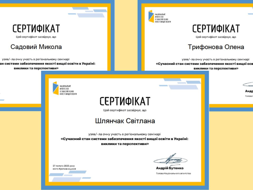 02 квітня 2025 року члени робочої групи (к.пед.н., доц. С.О.Шлянчак, д.пед.н., проф. М.І.Садовий, д.пед.н., проф. О.М.Трифонова) освітньої програми Професійна освіта (Цифрові технології) отримали сертифікати про участь в регіональному семінарі «Сучасний стан системи забезпечення якості вищої освіти в Україні: виклики та перспективи», що відбувся в місті Кропивницький.