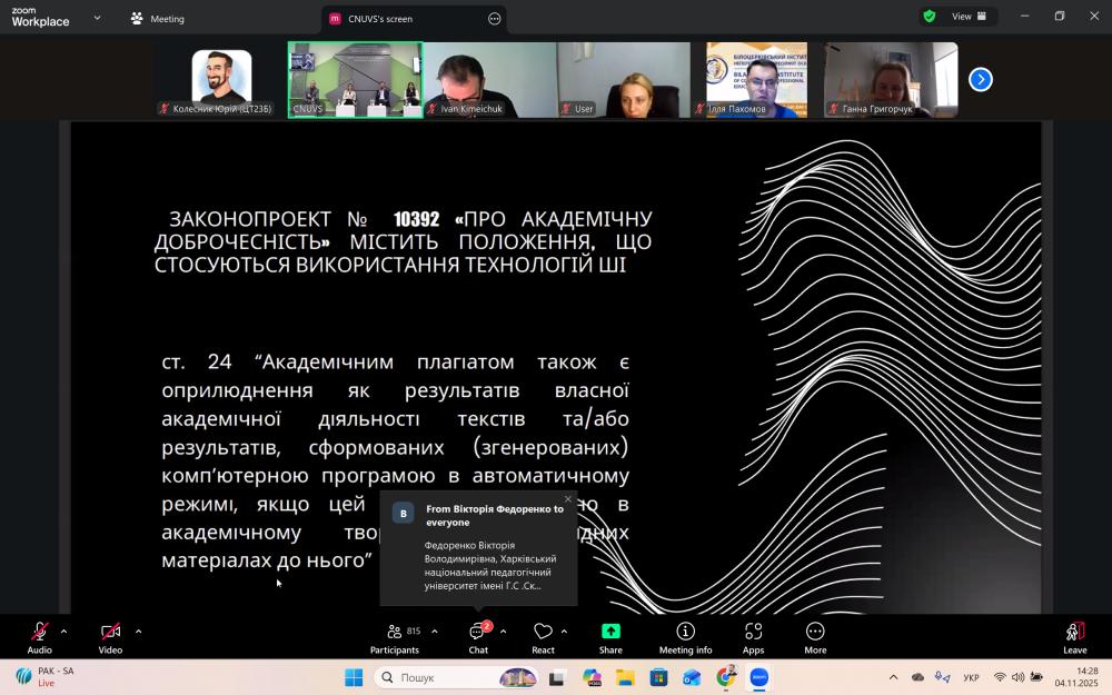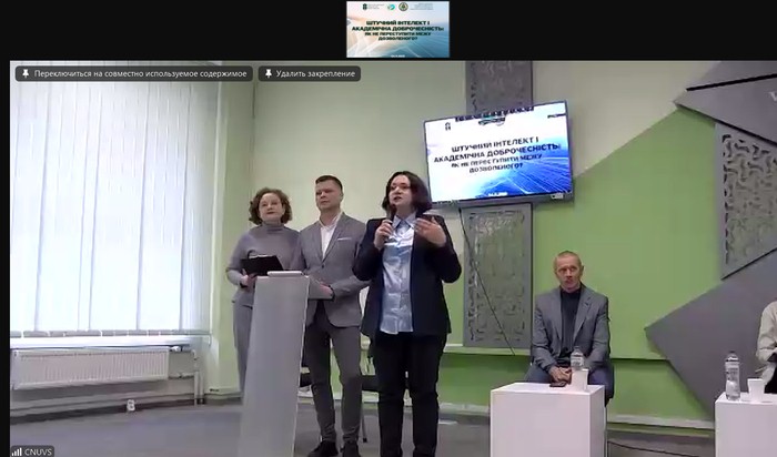 05 листопада 2025 року відбувся актуальний вебінар на тему «Прозорість та академічна доброчесність у роботі з ШІ». Активним учасником заходу став студент групи ЦТ23Б Колесник Юрій (освітня програма Професійна освіта (Цифрові технології)). Вела вебінар і виступила з доповіддю Наталя Юріївна Цибуляк, кандидат психологічних наук, доцент.