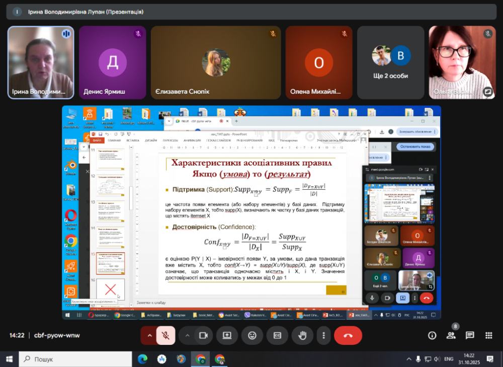 31 жовтня відкрите заняття з дисципліни «Інтелектуальний аналіз даних» для студентів групи КН23Б освітньо-професійної програми «Комп’ютерні науки» провела доцент кафедри інформаційних та цифрових технологій Ірина Лупан. На занятті були присутні завідувачка кафедри інформаційних та цифрових технологій, професор Олена Трифонова, доценти кафедри Ольга Рєзіна та старший викладачі Дмитро Соменко.