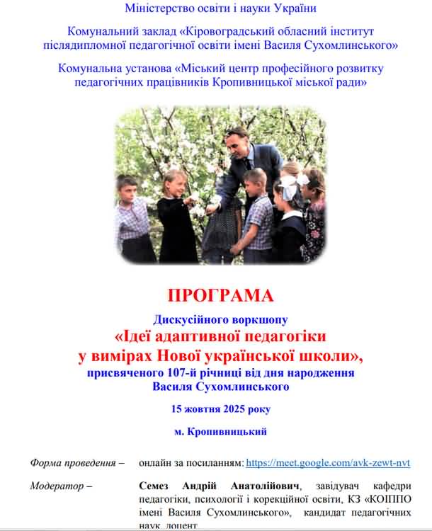 15 жовтня 2025 року на базі комунального закладу «Кіровоградський обласний інститут післядипломної педагогічної освіти імені Василя Сухомлинського» в режимі онлайн відбувся дискусійний воркшоп «Ідеї адаптивної педагогіки у вимірах Нової української школи», присвячений 107-й річниці від дня народження Василя Сухомлинського; у ньому взяли участь здобувачі освіти спеціальності 014 «Середня освіта (Біологія та здоров’я людини, Хімія») першого (бакалаврського) та другого (магістерського) рівня вищої освіти.