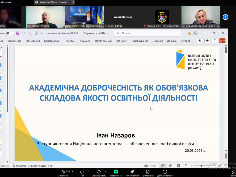 20 березня 2025 р. відбувся вебінар «Академічна доброчесність: виклики, проблеми та перспективи». Вебінар проводився за підтримки Національного агентства із забезпечення якості вищої освіти, ГО «Прогресильні».