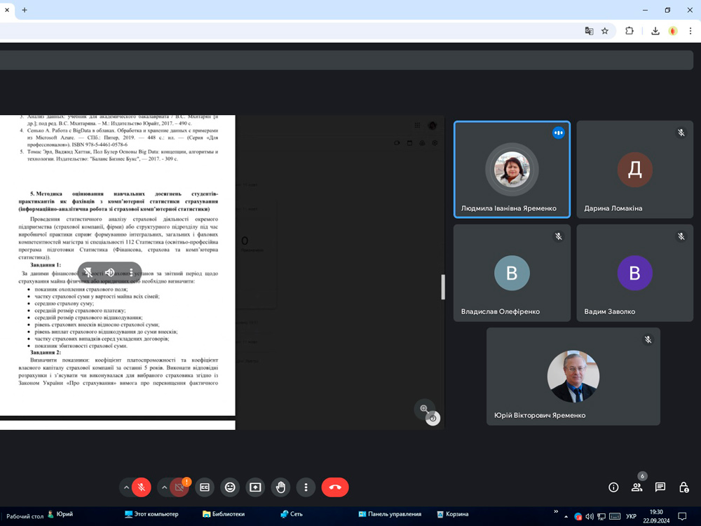 Студенти II курсу магістратури спеціальності 112 Статистика освітньої програми "Фінансова, страхова та комп’ютерна статистика" з 23 вересня 2024 року розпочали виконання завдань виробничої практики з комп’ютерної статистики. Метою цієї практики є закріплення теоретичних знань, які були отримані у процесі навчання, формування у студентів професійного вміння приймати самостійні рішення у виробничих умовах, оволодіння студентами сучасними методами аналізу великих масивів даних, статистичного аналізу страхової діяльності окремого підприємства (страхової компанії, фірми) або структурного підрозділу, формами організації, знаряддями праці у галузі їх майбутньої професії, аналітична діяльність здобувачів освіти за обраною предметною областю з використанням інструментів Business Intelligence і програмного забезпечення для статистичного аналізу, виховання у практикантів позитивних морально-етичних якостей, індивідуального стилю діяльності, потреби в самоосвіті.