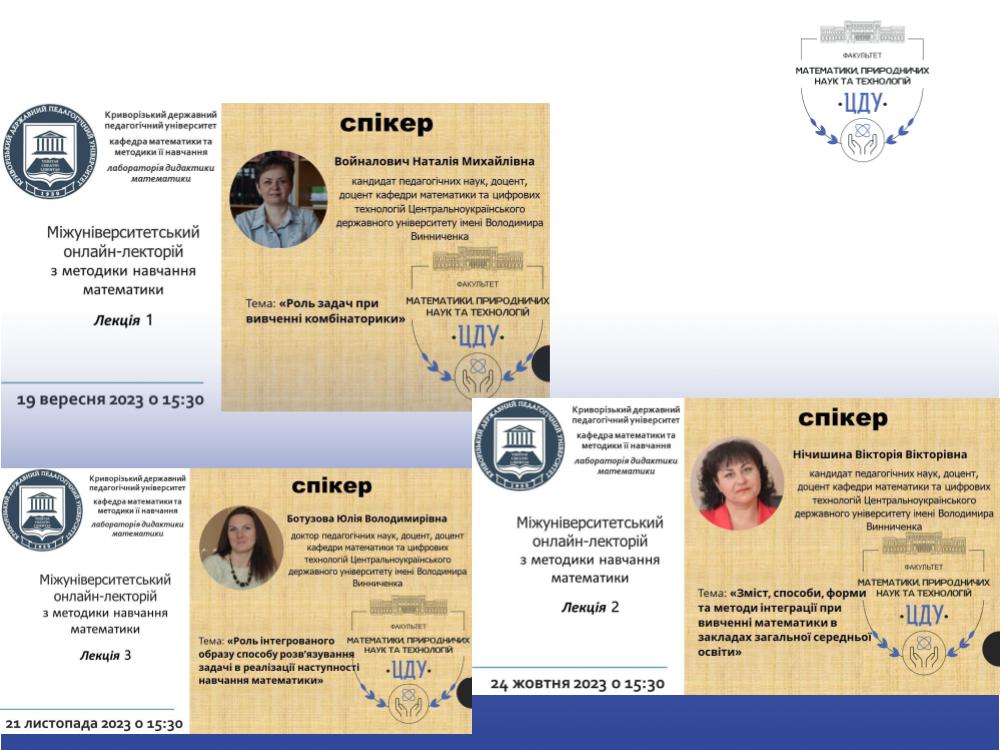 На засіданні кафедри математики та цифрових технологій доцентки Ботузова Ю., Войналович Н. та Нічишина В. відзвітували за проходження стажування (підвищення кваліфікації) на кафедрі математики та методики її навчання у Криворізькому державному педагогічному університеті. Стажування тривало 3 місяці – з 11 вересня до 08 грудня 2023 року. За цей період, окрім виконання завдань індивідуальних планів, викладачки долучилися до започаткування роботи міжуніверситетського онлайн-лекторію з методики навчання математики та провели лекції:
