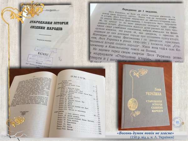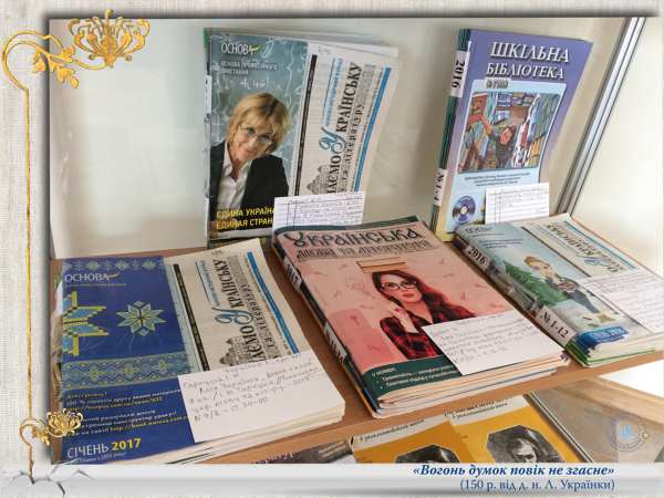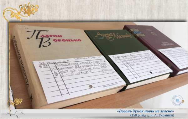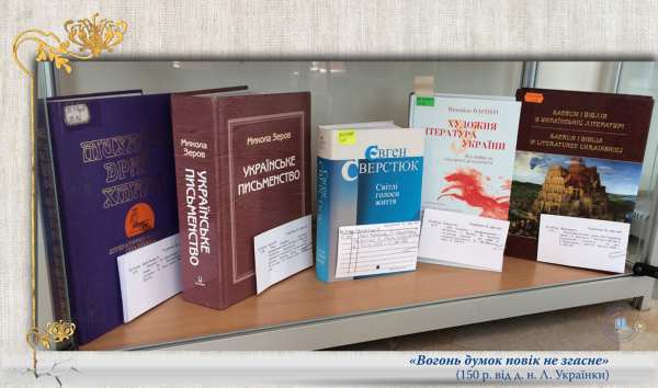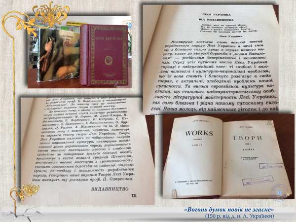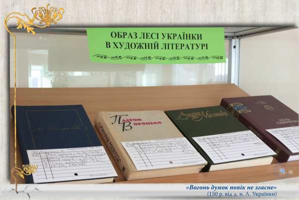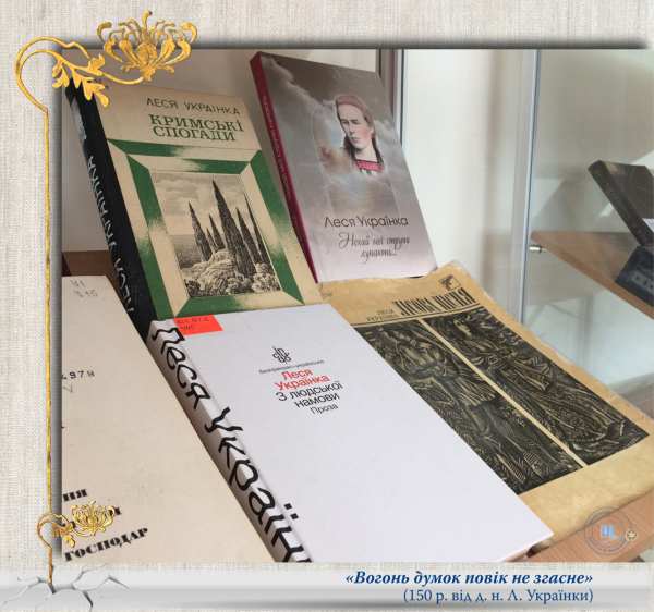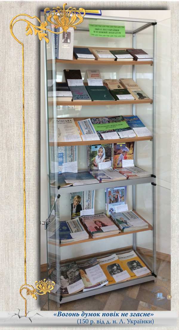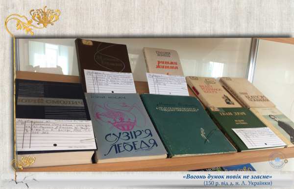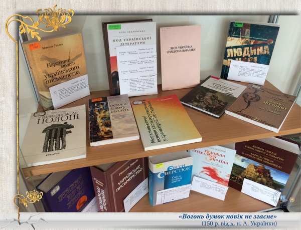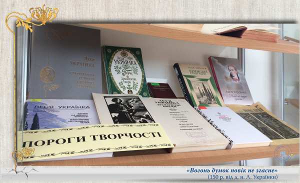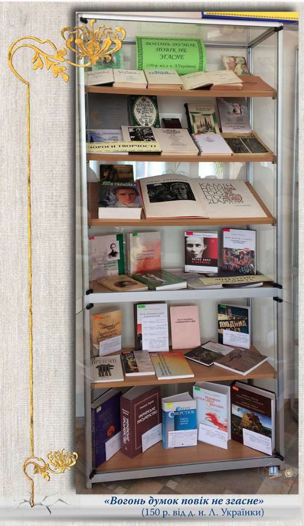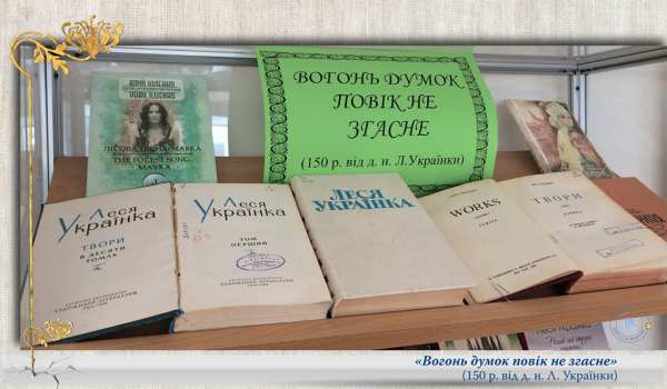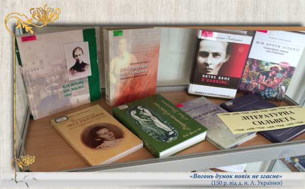 Ювілейна виставка, яка експонується в читальному залі філологічних дисциплін з 22 лютого, присвячена 150-річчю від дня народження видатної письменниці з прометеївським серцем Лесі Українці. Вона залишила нащадкам великий літературний доробок – полум’яну поезію, філософську драматургію, талановиту прозу, оригінальні публіцистичні та критичні статті, переклади та приватний епістолярій.